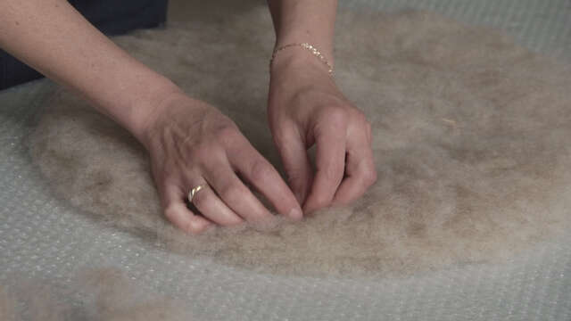 Dans le cadre de son métier, Mariche est amenée à transformer la laine avec de l’eau et du savon jusqu’à obtenir du feutre. Elle contacte des producteurs, des éleveurs, des personnes qui vendent de la laine et la transforme.